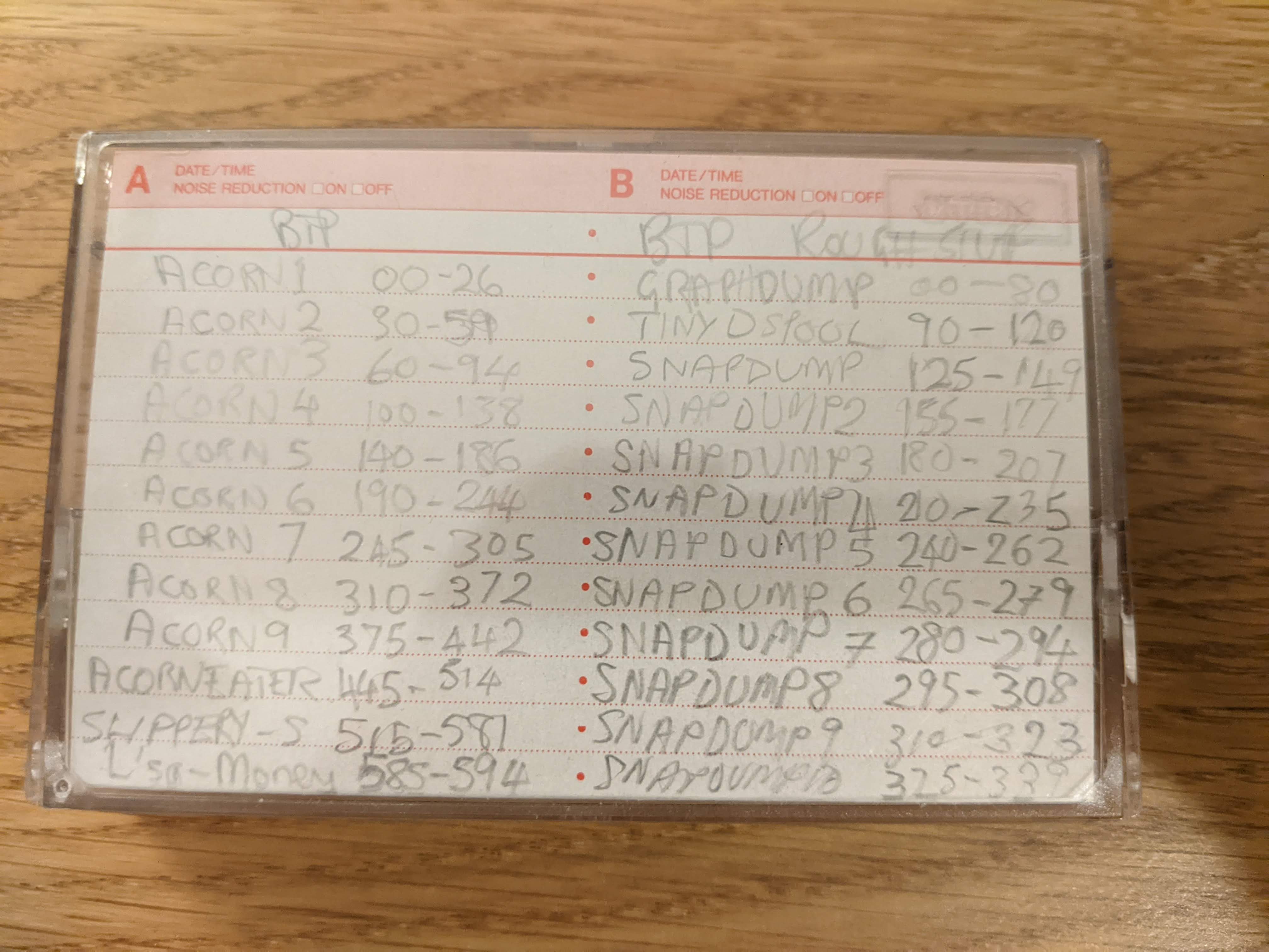Working on <box01_tape08b_d90_acorn_rough_stuff.wav> -- number of recordings: 2 Opened </mnt/ganymede4/dcf21/cassette_archive/box01/box01_tape012b_d90_acorn_rough_stuff.wav>: 1 channels, 48000 frames/sec, length 26m21.5s Tape digitisation date: Mon Jul 25 23:55:17 2022 [Start/sec ] [End/sec ] [Stat ] [Filename ] Size LoadAddr ExecAddr NextAddr Phases Information [ 9.53517] [ 118.29392] [ PASS] [GRAPHDUMP ] 1FBB FFFF0E00 FFFF8023 00000000 [--CD ] Last block 001F complete. [ 147.25906] [ 188.00131] [ PASS] [TINYDSPOOL] 0758 FFFFFFFF FFFFFFFF 00000000 [--CD ] Last block 0007 complete. [ 207.10877] [ 234.75365] [ PASS] [SNAPDUMP ] 080B FFFF0E00 FFFF8023 00000000 [--CD ] Last block 0008 complete. [ 258.93179] [ 285.81183] [ PASS] [SNAPDUMP2 ] 0839 FFFF0F00 FFFF8023 00000000 [--CD ] Last block 0008 complete. [ 301.19900] [ 334.72363] [ PASS] [SNAPDUMP3 ] 0A43 FFFF0E00 FFFF8023 00000000 [--CD ] Last block 000A complete. [ 353.70871] [ 387.36648] [ PASS] [SNAPDUMP4 ] 0A43 FFFF0E00 FFFF8023 00000000 [--CD ] Last block 000A complete. [ 407.92252] [ 436.16304] [ PASS] [SNAPDUMP5 ] 08CA FFFF1000 FFFF8023 00000000 [--CD ] Last block 0008 complete. [ 455.42206] [ 469.48323] [ PASS] [SNAPDUMP6 ] 041C FFFF0E00 FFFF8023 00000000 [--CD ] Last block 0004 complete. [ 485.70531] [ 500.09319] [ PASS] [SNAPDUMP7 ] 0426 FFFF0E00 FFFF8023 00000000 [--CD ] Last block 0004 complete. [ 515.21094] [ 530.09652] [ PASS] [SNAPDUMP8 ] 042F FFFF0E00 FFFF8023 00000000 [--CD ] Last block 0004 complete. [ 546.82092] [ 561.65179] [ PASS] [SNAPDUMP9 ] 0423 FFFF0E00 FFFF8023 00000000 [--CD ] Last block 0004 complete. [ 579.45133] [ 595.71483] [ PASS] [SNAPDUMP10] 04B7 FFFF0E00 FFFF8023 00000000 [--CD ] Last block 0004 complete. [ 604.61167] [ 695.35315] [*FAIL] [SCREEN ] 1A00 00005800 00005800 00000000 [--CD ] From block 0007 only. [ 710.64731] [ 751.96652] [ PASS] [RICOCHE ] 0BED 00000E00 00000E00 00000000 [--CD ] Last block 000B complete. [ 768.37271] [ 778.06854] [ PASS] [RICO/1 ] 02FF 00000900 00000900 00000000 [--CD ] Last block 0002 complete. [ 803.50794] [ 825.71656] [ PASS] [RICO/2 ] 0643 00003000 00003000 00000000 [--CD ] Last block 0006 complete. [ 851.56660] [ 992.43725] [ PASS] [RIC/SCR ] 2800 00005800 00005800 00000000 [--CD ] Last block 0027 complete. [1010.23644] [1311.57996] [ PASS] [RICCD/TAPE] 54ED 00000E53 00001953 00000000 [--CD ] Last block 0054 complete. [1333.50225] [1343.03629] [ PASS] [RICO/1 ] 02FF 00000900 00000900 00000000 [--CD ] Last block 0002 complete. [1361.79648] [1364.33225] [ PASS] [RICO/5 ] 00FB 00000BBA 00000BBA 00000000 [--CD ] Last block 0000 complete. [1389.28044] [1390.47113] [ PASS] [RIC/SNE ] 0068 00001000 00000000 00000000 [--CD ] Last block 0000 complete. [1416.37454] [1547.70265] [ PASS] [RICDIM2 ] 2591 00002000 00002000 00000000 [--CD ] Last block 0025 complete. Recovered 81921 bytes. Opened </mnt/ganymede4/dcf21/cassette_archive_2/box01/box01_tape012b_d90_acorn_rough_stuff.wav>: 1 channels, 48000 frames/sec, length 26m44.2s Tape digitisation date: Fri Nov 4 20:32:45 2022 [Start/sec ] [End/sec ] [Stat ] [Filename ] Size LoadAddr ExecAddr NextAddr Phases Information [ 10.56619] [ 116.70750] [ PASS] [GRAPHDUMP ] 1FBB FFFF0E00 FFFF8023 00000000 [A-CD ] Last block 001F complete. [ 144.83502] [ 183.96733] [ PASS] [TINYDSPOOL] 0758 FFFFFFFF FFFFFFFF 00000000 [A-CD ] Last block 0007 complete. [ 202.69304] [ 229.93871] [ PASS] [SNAPDUMP ] 080B FFFF0E00 FFFF8023 00000000 [A-CD ] Last block 0008 complete. [ 254.51733] [ 282.15817] [ PASS] [SNAPDUMP2 ] 0839 FFFF0F00 FFFF8023 00000000 [A-CD ] Last block 0008 complete. [ 298.01281] [ 332.49954] [ PASS] [SNAPDUMP3 ] 0A43 FFFF0E00 FFFF8023 00000000 [A-CD ] Last block 000A complete. [ 351.98808] [ 386.48781] [ PASS] [SNAPDUMP4 ] 0A43 FFFF0E00 FFFF8023 00000000 [A-CD ] Last block 000A complete. [ 407.60500] [ 436.50415] [ PASS] [SNAPDUMP5 ] 08CA FFFF1000 FFFF8023 00000000 [A-CD ] Last block 0008 complete. [ 455.77692] [ 469.70342] [ PASS] [SNAPDUMP6 ] 041C FFFF0E00 FFFF8023 00000000 [A-CD ] Last block 0004 complete. [ 485.48365] [ 499.50494] [ PASS] [SNAPDUMP7 ] 0426 FFFF0E00 FFFF8023 00000000 [A-CD ] Last block 0004 complete. [ 513.93650] [ 528.04433] [ PASS] [SNAPDUMP8 ] 042F FFFF0E00 FFFF8023 00000000 [A-CD ] Last block 0004 complete. [ 543.85750] [ 557.85485] [ PASS] [SNAPDUMP9 ] 0423 FFFF0E00 FFFF8023 00000000 [A-CD ] Last block 0004 complete. [ 574.65552] [ 589.92431] [ PASS] [SNAPDUMP10] 04B7 FFFF0E00 FFFF8023 00000000 [A-CD ] Last block 0004 complete. [ 598.29833] [ 684.32331] [*FAIL] [SCREEN ] 1A00 00005800 00005800 00000000 [A-CD ] From block 0007 only. [ 698.78196] [ 737.83202] [ PASS] [RICOCHE ] 0BED 00000E00 00000E00 00000000 [A-CD ] Last block 000B complete. [ 753.23288] [ 762.32650] [ PASS] [RICO/1 ] 02FF 00000900 00000900 00000000 [A-CD ] Last block 0002 complete. [ 786.22698] [ 807.09208] [ PASS] [RICO/2 ] 0643 00003000 00003000 00000000 [A-CD ] Last block 0006 complete. [ 831.42225] [ 964.17327] [ PASS] [RIC/SCR ] 2800 00005800 00005800 00000000 [A-CD ] Last block 0027 complete. [ 981.07685] [1265.67115] [ PASS] [RICCD/TAPE] 54ED 00000E53 00001953 00000000 [A-CD ] Last block 0054 complete. [1286.48067] [1295.57906] [ PASS] [RICO/1 ] 02FF 00000900 00000900 00000000 [A-CD ] Last block 0002 complete. [1313.23075] [1315.61015] [ PASS] [RICO/5 ] 00FB 00000BBA 00000BBA 00000000 [A-CD ] Last block 0000 complete. [1339.35427] [1340.48779] [ PASS] [RIC/SNE ] 0068 00001000 00000000 00000000 [A-CD ] Last block 0000 complete. [1365.11208] [1490.25027] [ PASS] [RICDIM2 ] 2591 00002000 00002000 00000000 [A-CD ] Last block 0025 complete. Recovered 81921 bytes. Best version: </mnt/ganymede4/dcf21/cassette_archive_2/box01/box01_tape012b_d90_acorn_rough_stuff.wav>